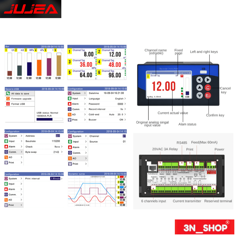 • Paperless recorder, 6-channel universal input, 160*80 panel size. It supports industrial signals such as current, voltage, thermocouple, thermal resistance and frequency (customized), and realizes signal data recording function. The recording interval is as short as 1 second, and historical data can be quickly transferred through USB devices. Channel data is displayed in real time as numerical values, bar graphs and curves.